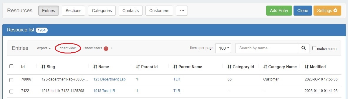 You can also access Chart View from a resource entry page by clicking the "Open Chart View" button at the top. This will automatically position the entry as the "Top Resource" in the chart.