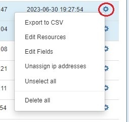 To export multiple resources, select the desired resources from the resource list, then open the action menu and click "Export to CSV".