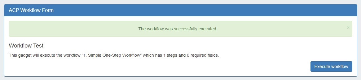Once ACP settings have been added to Admin Preferences, the "ACP Workflow Form" Gadget can be added to a section, containing fields to select the desired workflow to run, title, and map input options.