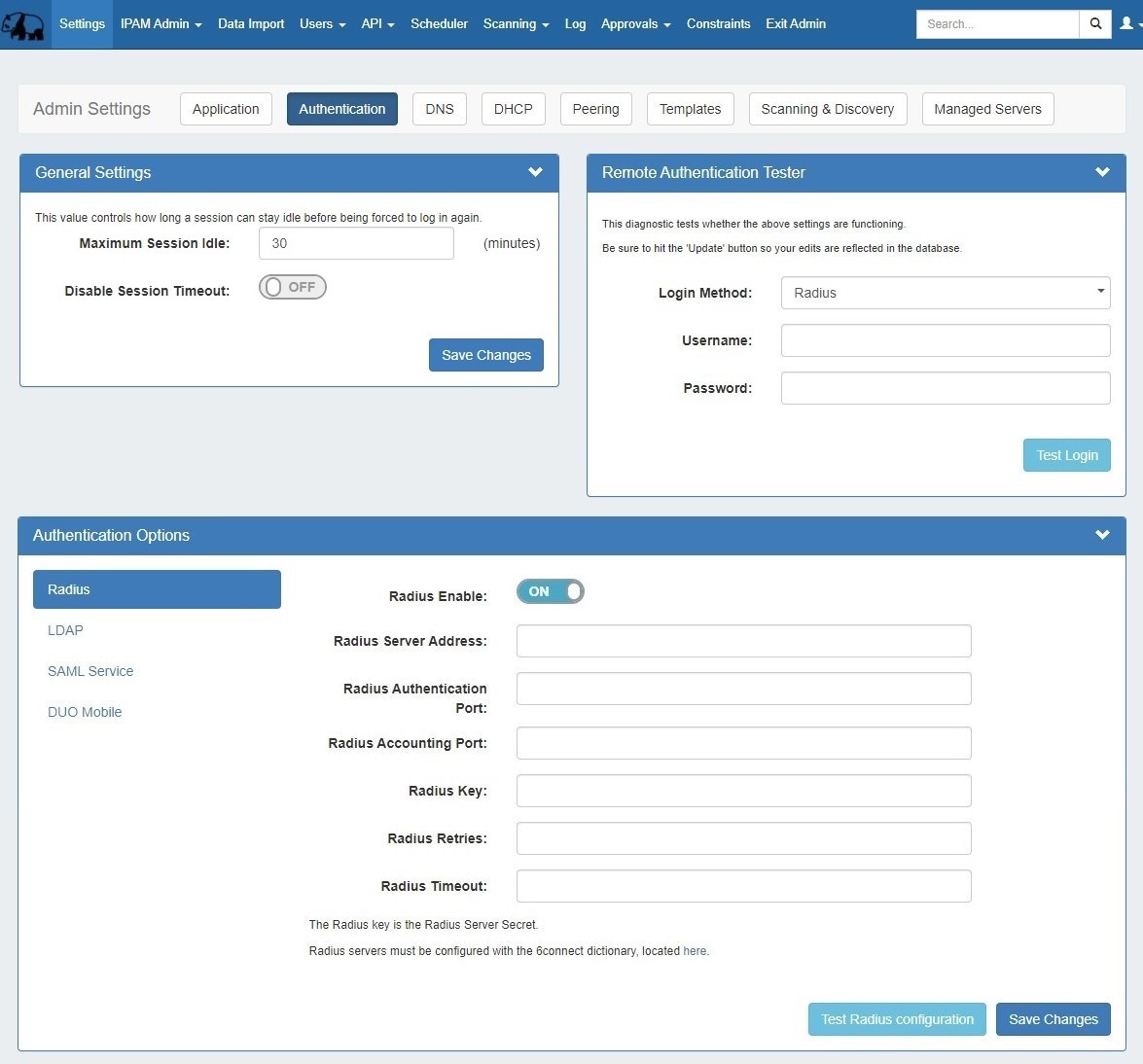 In this area, you may set the max session idle time, as well as setup additional authentication options. Four non-local authentication types are available: Radius, LDAP, SAML, and DUO Mobile. For general authentication settings and options, see the settings below.