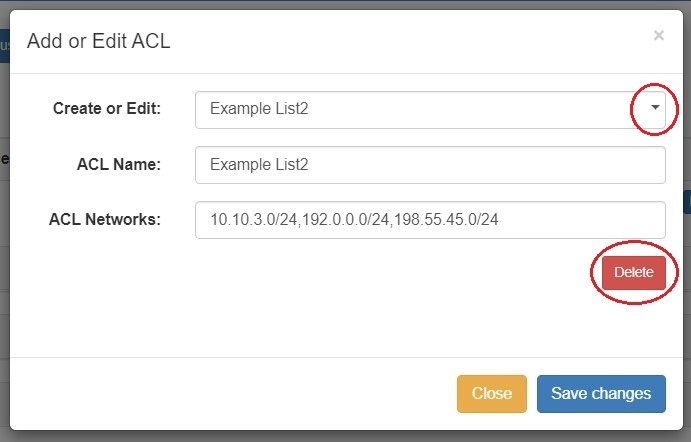 Select the ACL you wish to delete from the "Create or Edit" selector. Then, click the red "Delete" button under the Networks field.