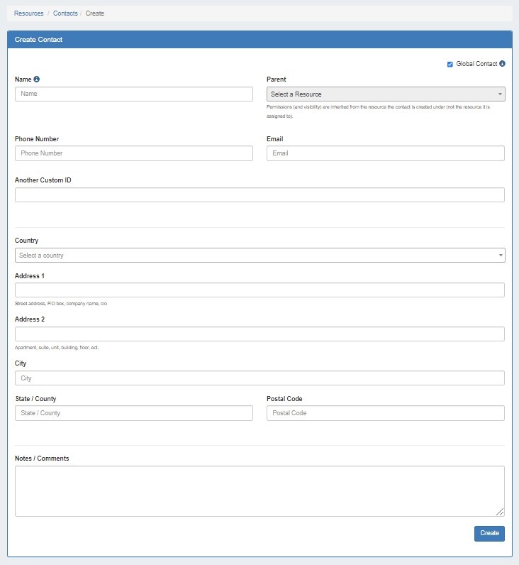 Fill in the contact's information for Name, Parent Resource (if desired), Phone, Custom ID, Email, Address, and Comments if desired.