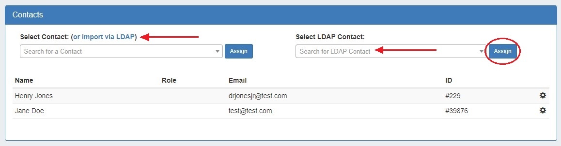 You can also import and assign a contact via LDAP from the Contacts Gadget. Click on "import via LDAP" and a separate search box will appear. Search for an LDAP contact and hit "Assign".