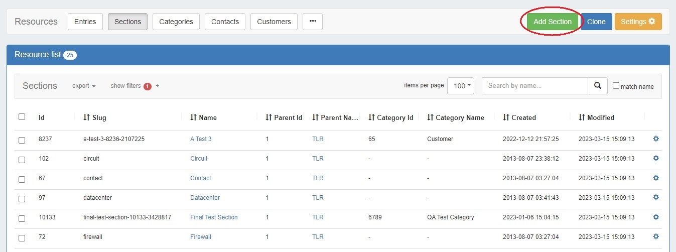 Create a new section by specifying a name and category. Then hit the "Create" button.