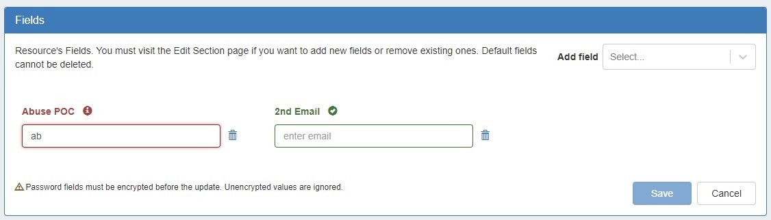 A constrained field is available to edit from the Resource List Edit Fields modal and the Resource's Fields Gadget.