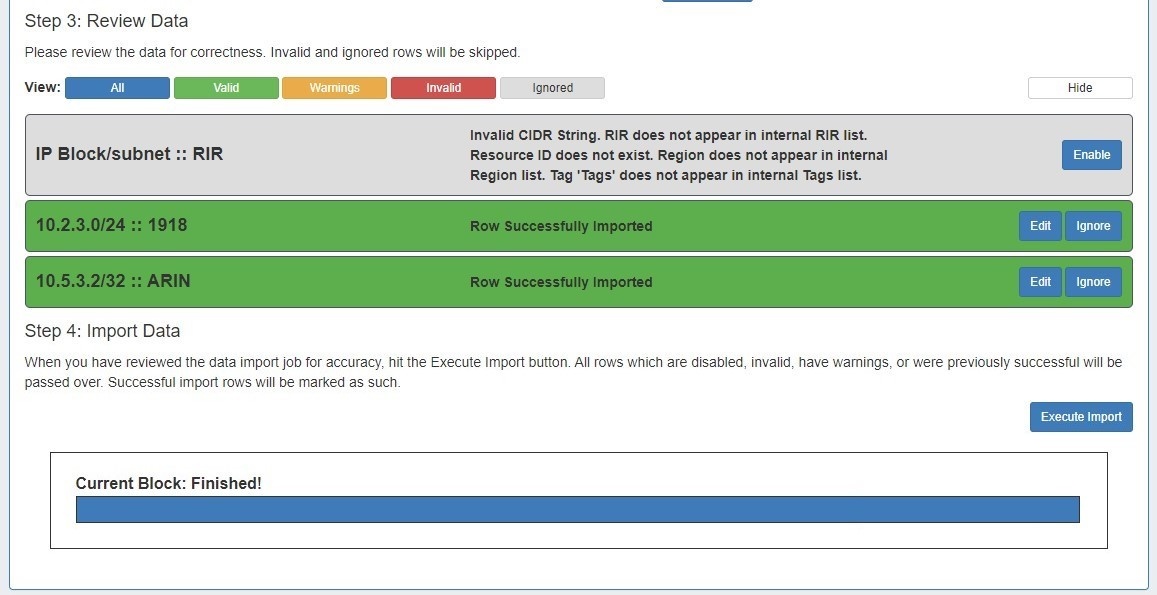 - If the IP Import was only partially successful or requires additional review, you may keep the import job in the "Existing Jobs" list and revise the failed / invalid blocks at a later time. Re-running the import from the same job will allow you to re-attempt import on only the previously unsuccessful / ignored / edited blocks - successfully imported and unchanged blocks will not be affected.
