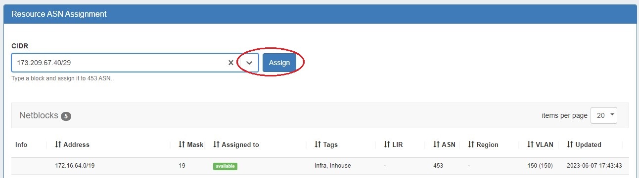 To assign an IP block to a ASN, VLAN, or Region resource, select the block from the dropdown and click "Assign".