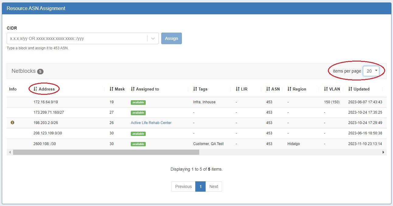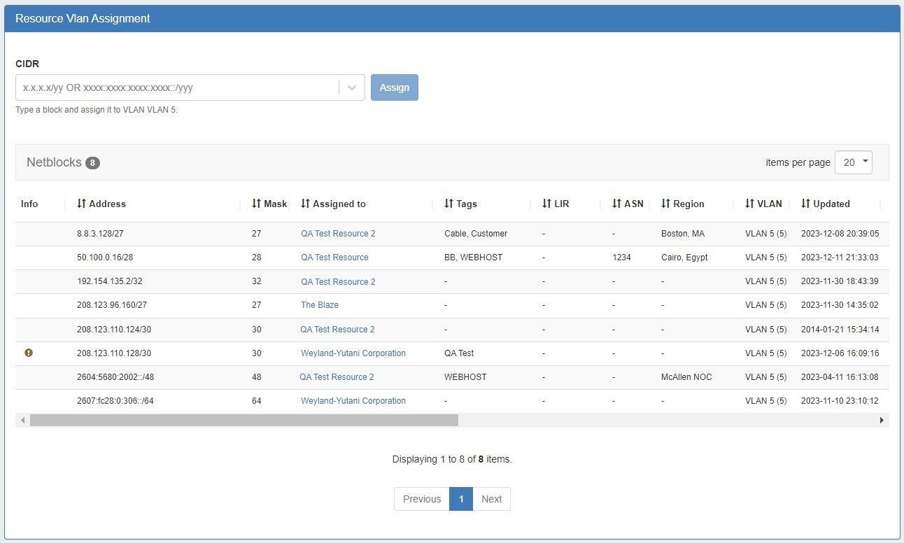 The Assignment Gadgets provide pagination and sortable columns, and allow users to quickly Direct Assign an IP to an ASN, VLAN, or Region resource from the gadget.