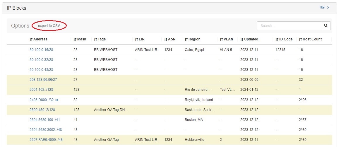 View, search, filter, and sort Assigned Blocks for the resource via the "IP Blocks" list: