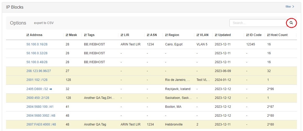 To Search: enter a full or partial CIDR, assigned resource name, or other search term into the search box at the top of the list and click the search icon.