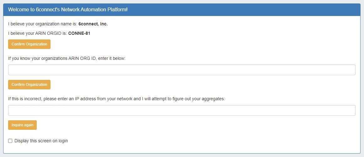 We automatically lookup your ARIN or RIPE information based on the IP address you are connected to: