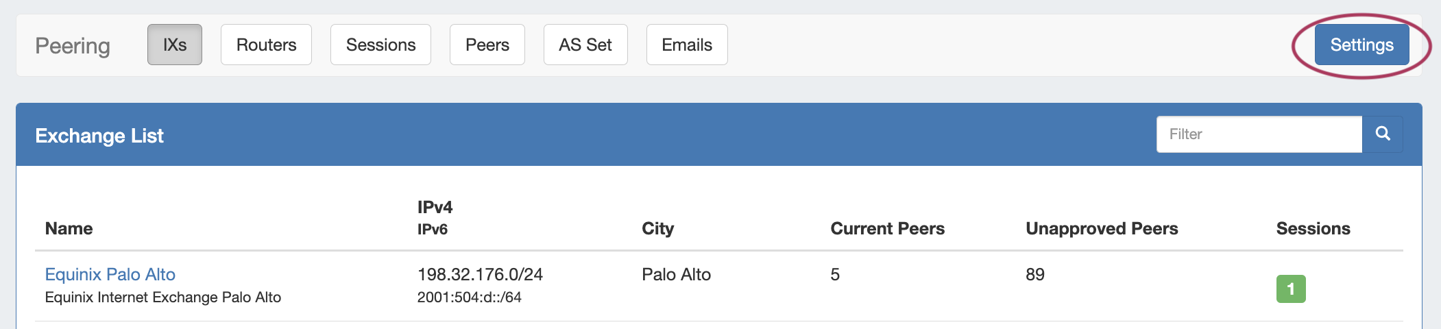 - The IXs tab shows the exchange list. From here, you can edit exchange settings and view, manage, and mark peer status and communications via the exchange details page.