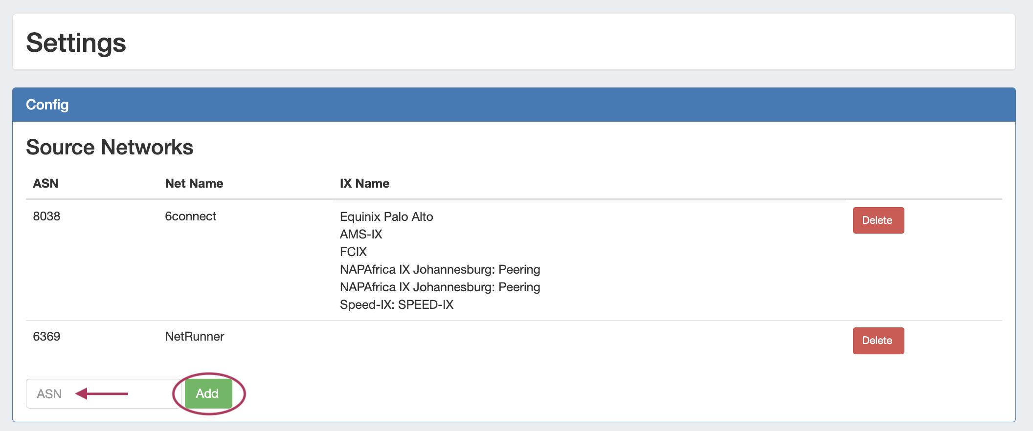 Add at least one ASN to ProVision from either the Admin → Admin Preferences → Peering page, or via the Peering Tab -> Exchange Settings.