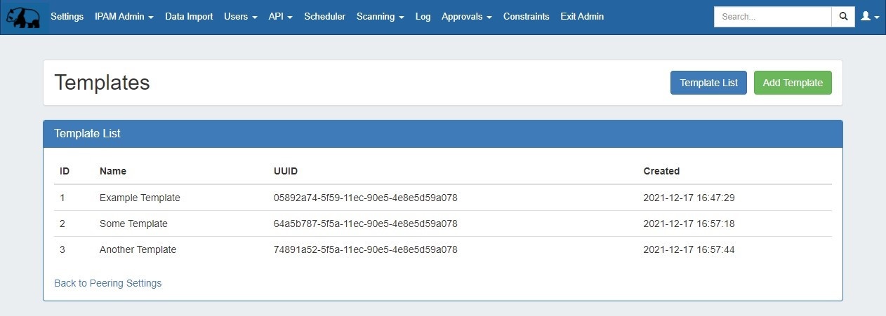 The Template List will open, displaying all existing Peering Templates.