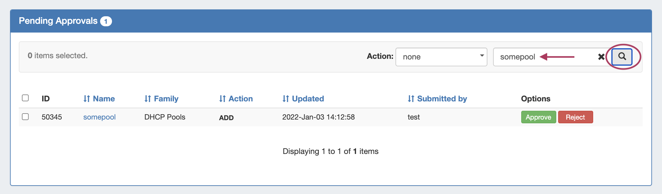 A Resources Awaiting Approval module will display in the relevant DNS / DHCP areas, if a change has been submitted on that page either by the current user, or that the current user may Approve/Deny.
