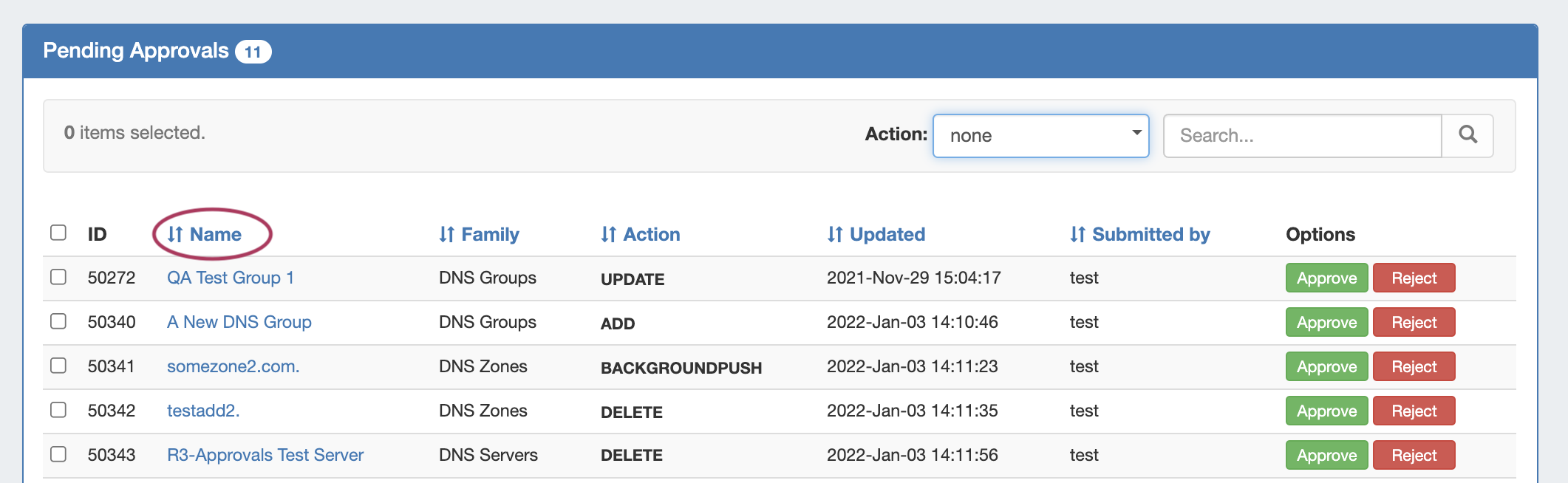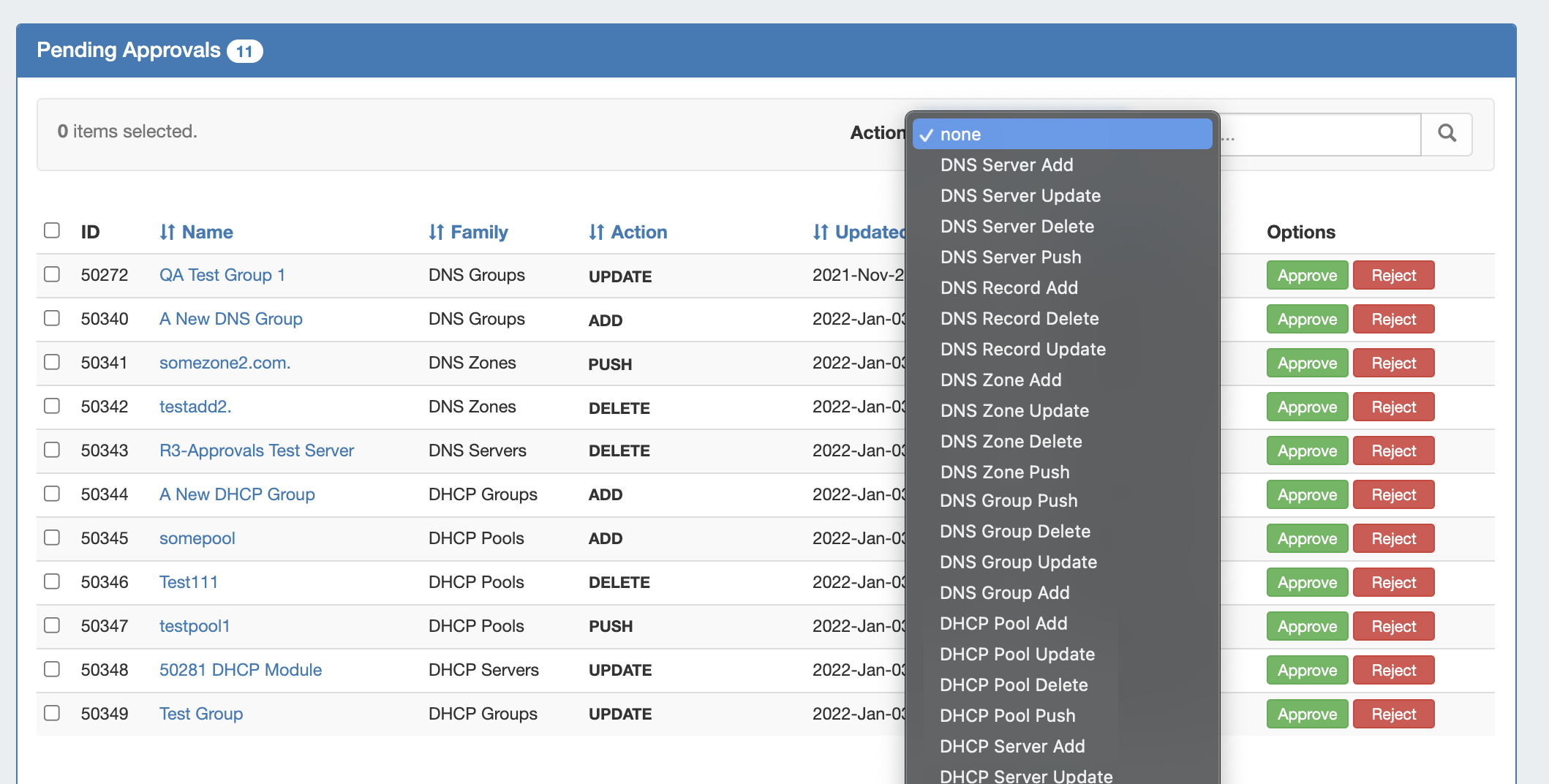 The Approvals module stores and queues DNS or DHCP actions made by selected User Groups, and sends those actions to a Pending Changes list for administrative review. Later, an administrator (or combination of administrators) can approve or reject these stored actions.