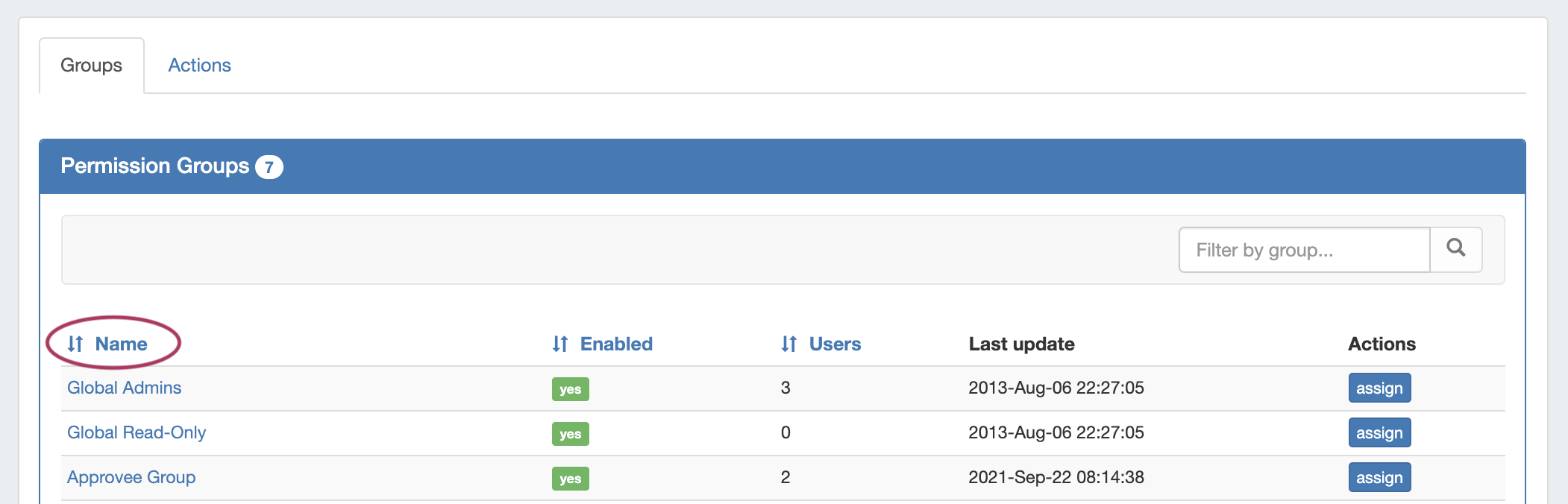 Sort the Permission Groups list by Name, Enabled, or Users by clicking on the column name.