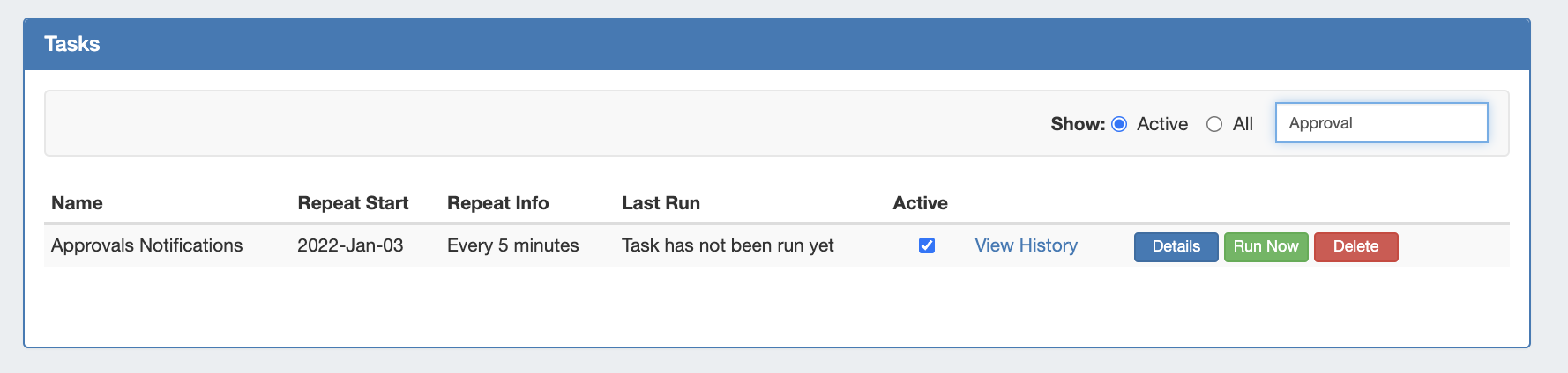 The Approvals Email Notification task is now set up, active, and ready to process Approvals Event changes.