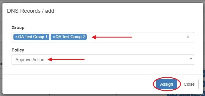Select the Group(s) that you wish to assign, and select the policy to apply to the action. When done, click the "Assign" button to save.