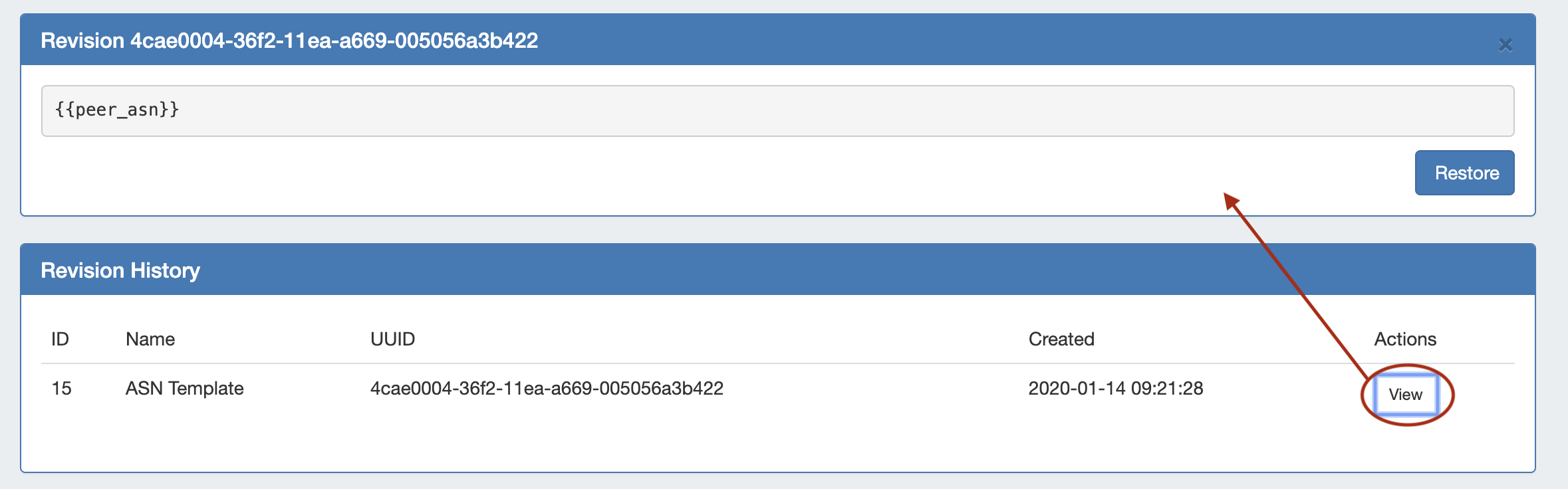 To restore the template back to that revision number, click the "Restore" button for the revision preview.