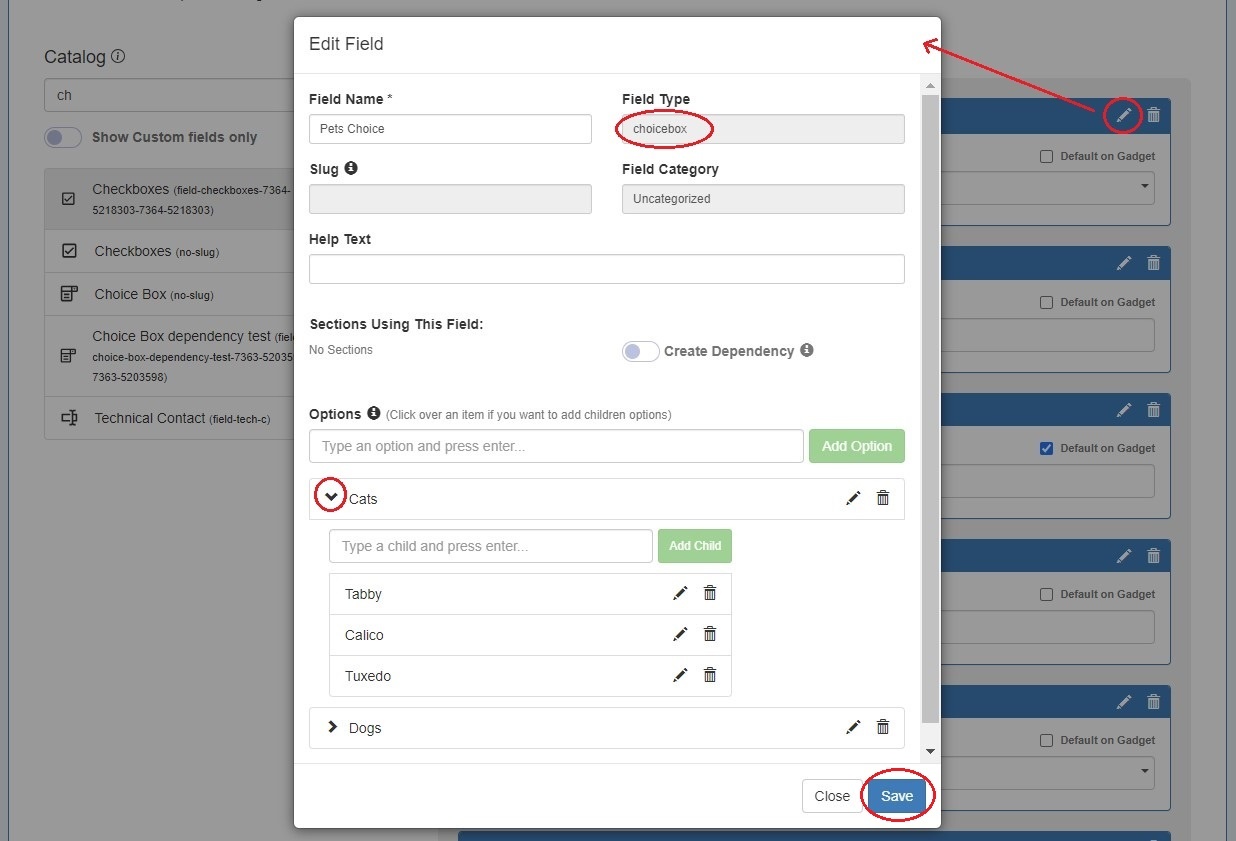 To add a dependent field go to the Section Edit page. Add a choicebox field from the catalog and open edit. Add options, then add children to the options. Click save. If adding a new custom field, you will need to save from the main "Manage Fields" tab as well.