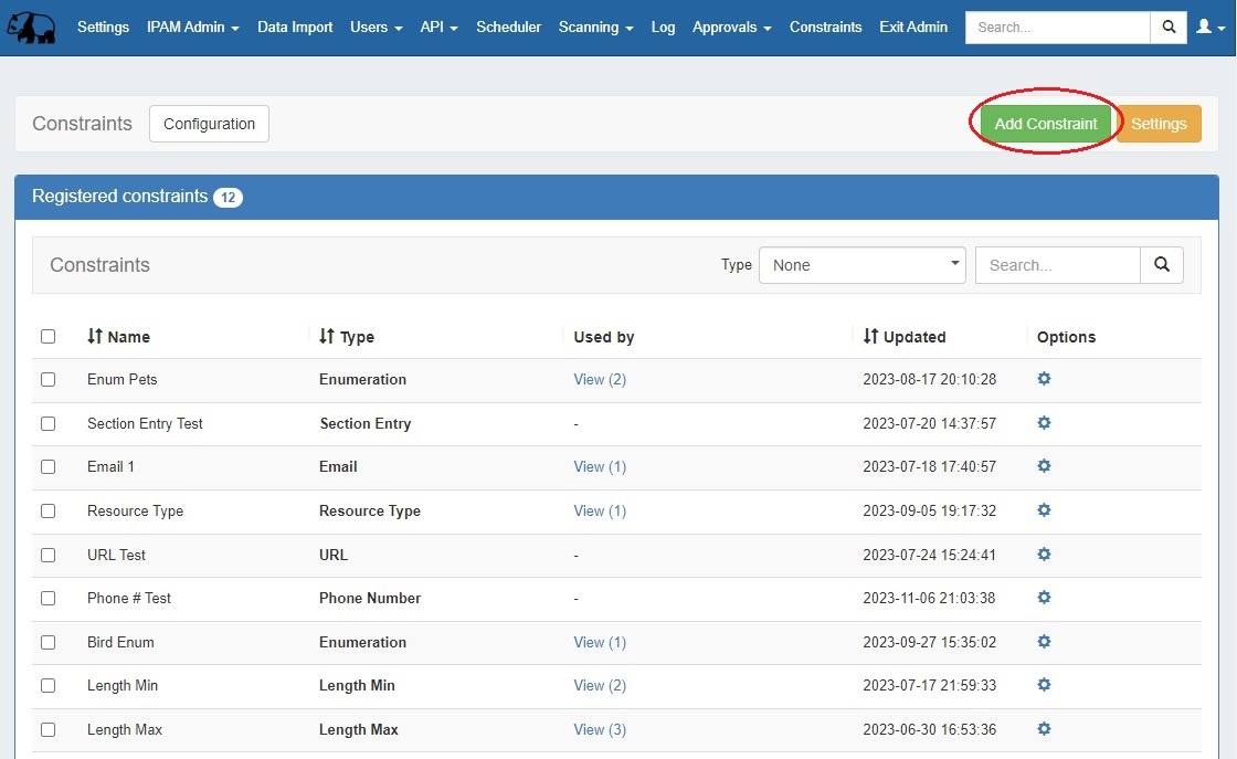 The Constraints system has been expanded to Resource fields. Constraints are now applied directly from the Admin IPAM Columns page or to Resource fields from the Edit Section page. New constraints are added from the Admin Constraints page.