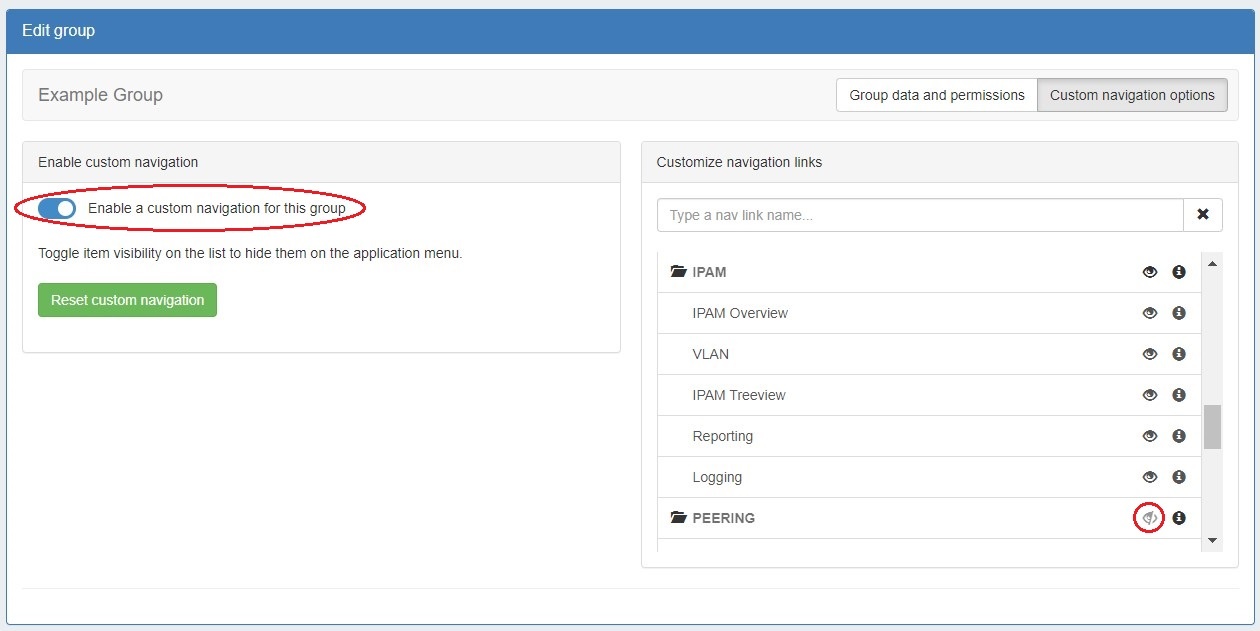 Enable the custom navigation selector and a menu of navigation links will appear. Use the eye icons to hide links from view of users in the group. For example, this group has no Peering permissions (as seen in the above image). Via custom navigation options you can simply hide the entire Peering tab from view for this group of users.