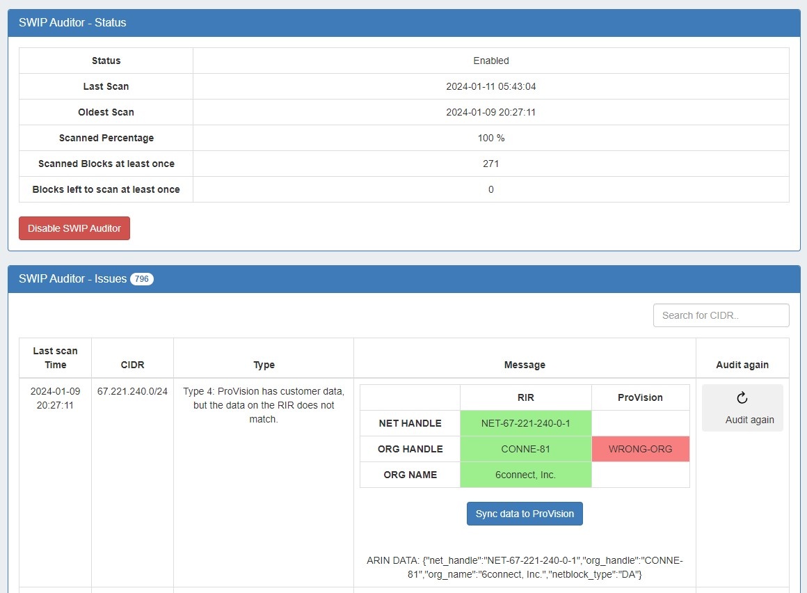 Customers often have data in ProVision that does not match the RIR database. SWIP Auditor helps solve this issue by making the user aware of the mismatch. Located in the IPAM Admin section, the Auditor also includes a Scheduler task.