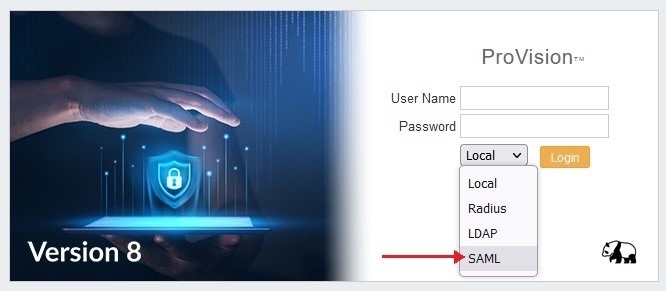 After the initial login via the IdP (as long as the auth token is present) users will be able to login to ProVision simply by selecting the "SAML" options from the ProVision login page without entering credentials.