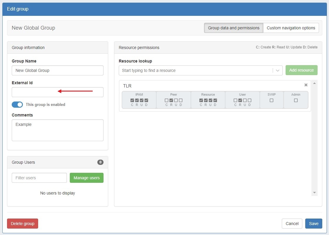 For some SAML providers it is not possible to have a user friendly group name. For example, while ProVision tries to match ProVision group names against Microsoft Azure group names, MS Azure exports group names like "abc-GFHEKJSHD-123". In these cases, you can set the "External ID" field for a group (in the below example "New Global Group") to be equal to "abc-GFHEKJSHD-123". Then, when logging in via SAML, ProVision will correctly recognize that the SAML User should be part of the “New Global Group” group.