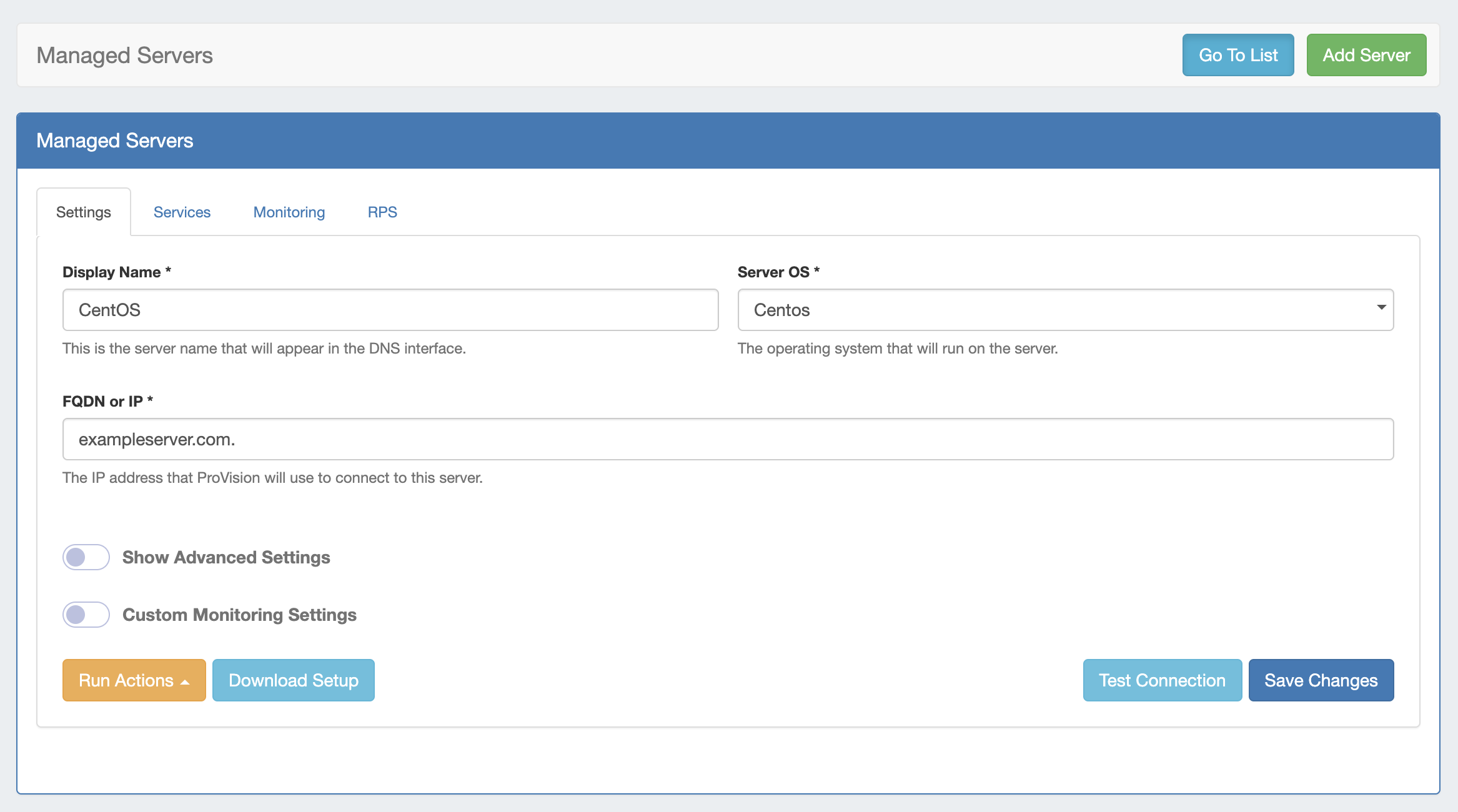 Managed servers require a ProVision user account and API IP in order to communicate configuration, data, and monitoring information.