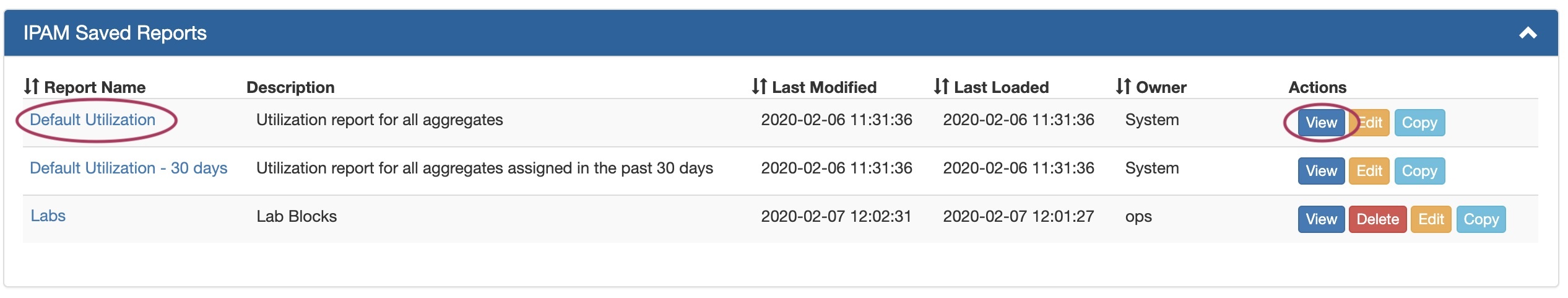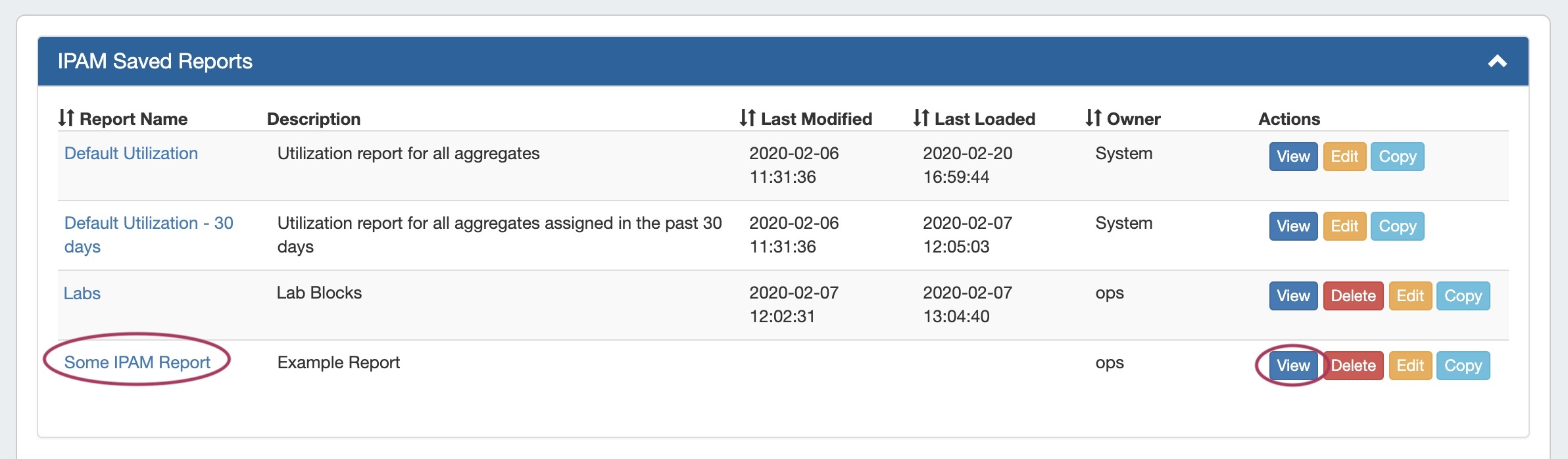 • Open a report by clicking on the report name link, or click View under Actions (opens Report View)