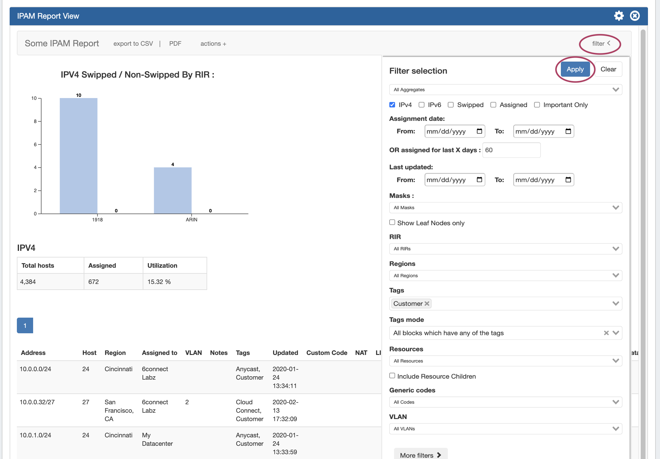 For our example, "Some IPAM Report", we have selected IPv4 blocks assigned in the last 60 days, that have the "Customer" tag.