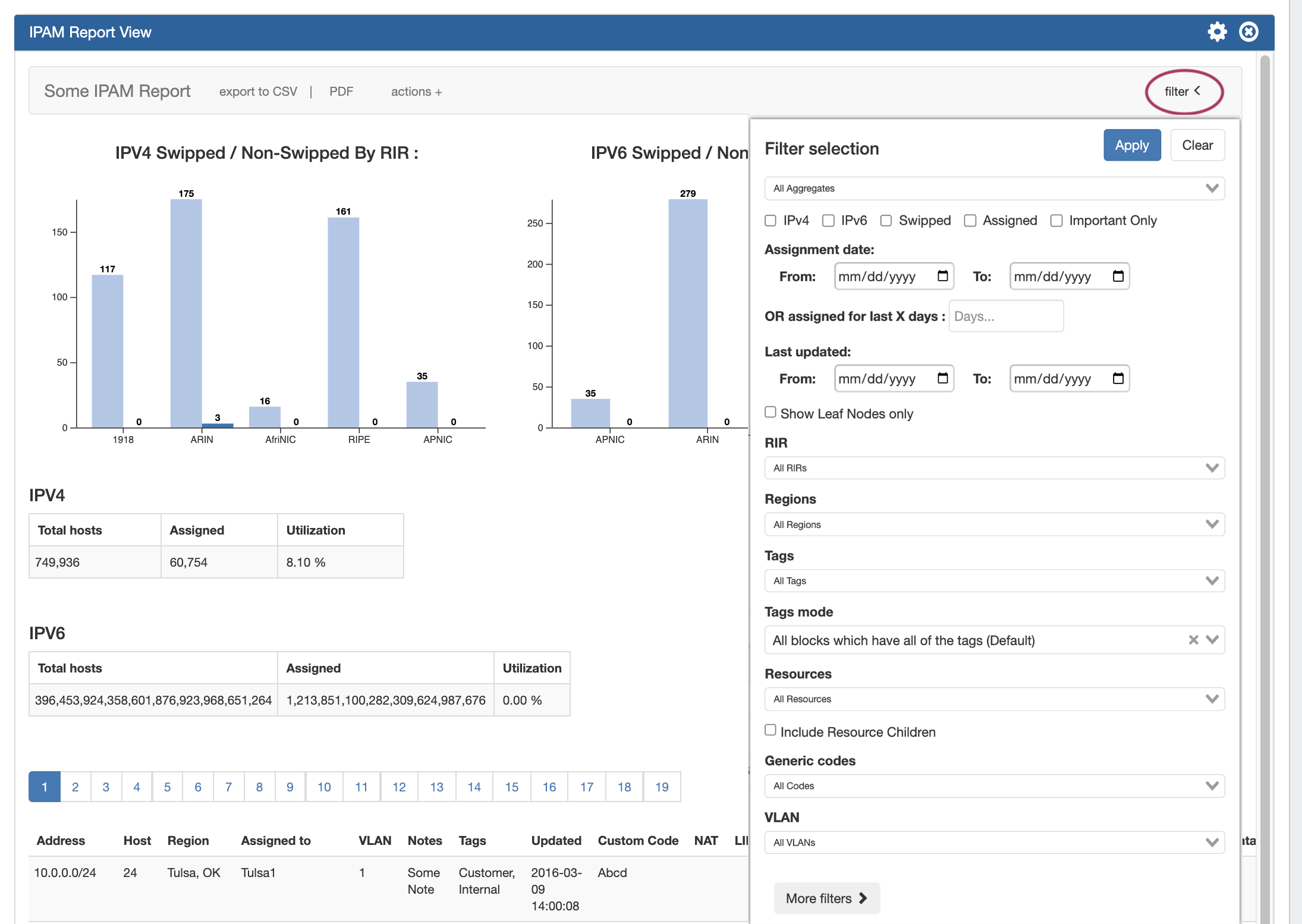 • IPAM Utilizations report - displays IPv4/IPv6 Swipped and Non-Swipped by RIR bar charts, with host utilization tables