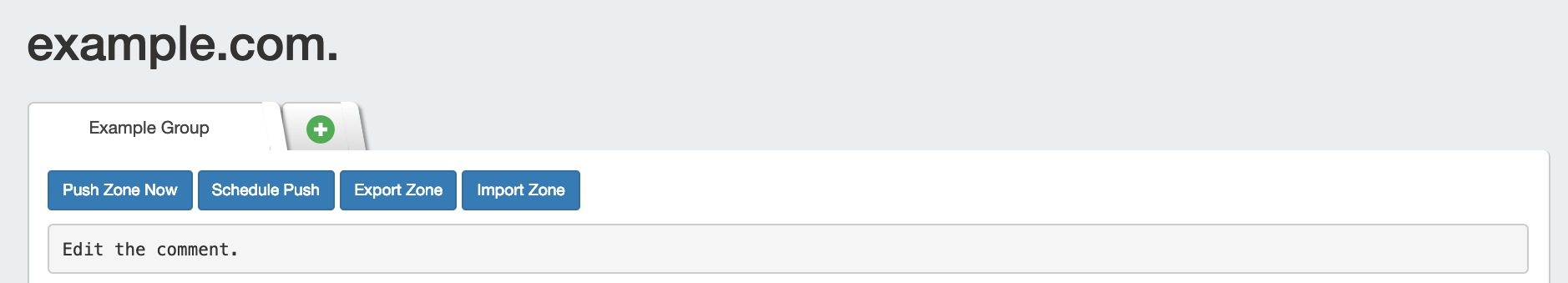 Clicking on the zone name opens up the Zone View page, from where comments may be added, records added or updated, servers attached to the zone, advanced settings edited, backups restored or the zone pushed / exported.