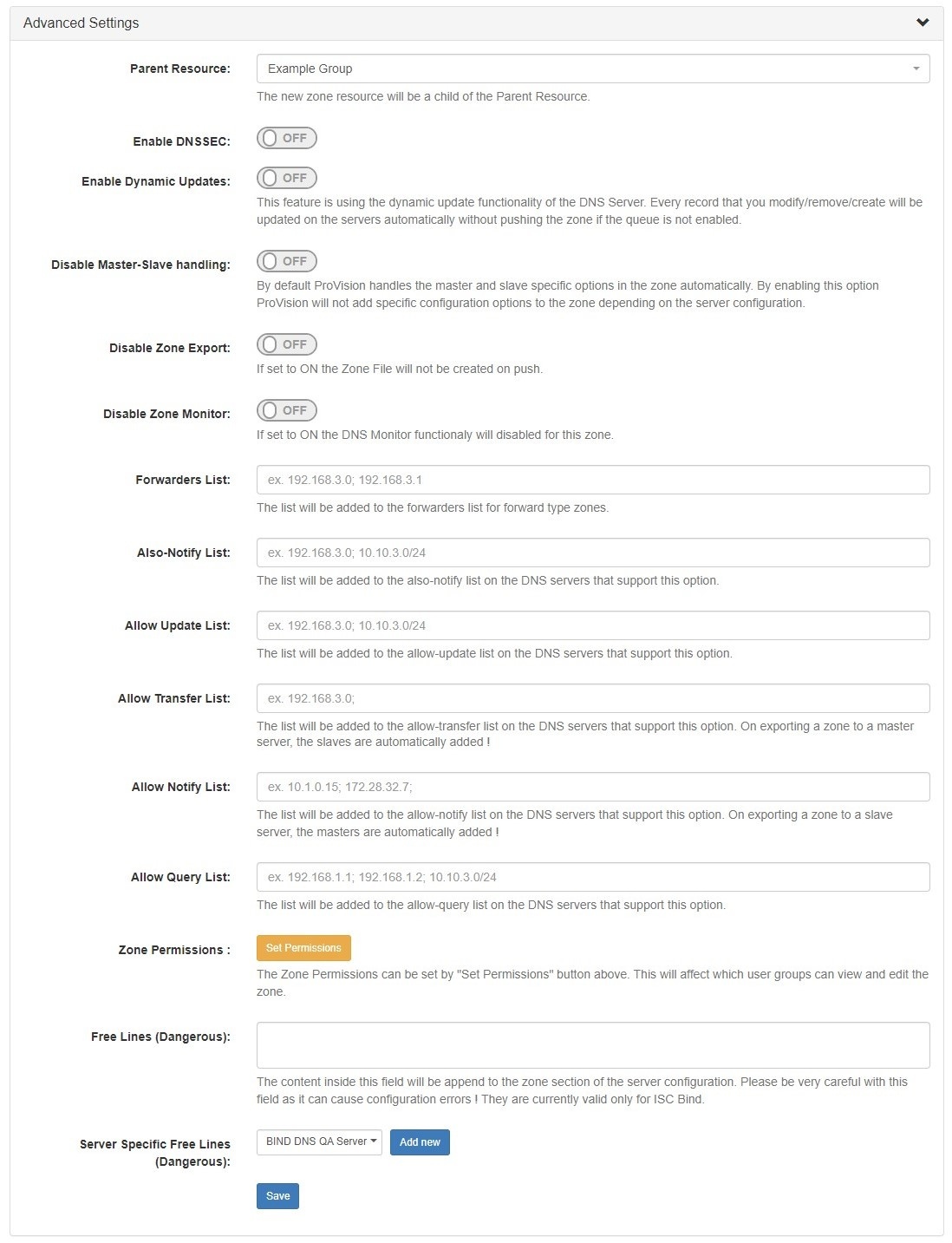 Free Lines: Enter free lines to append to the zone section of the server configuration for the attached server (ISC BIND only). Use with caution - this can cause configuration errors if mistakenly included.