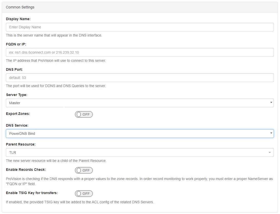 In the "Common Settings" section of Server Settings, enter the new server's Display Name (the name that will appear on the ProVision interface), the FQDN / IP, server type, DNS service type, and desired parent Resource (may be left at the default Top Level Resource). For PowerDNS servers, ensure that either "PowerDNS BIND" or "PowerDNS MySQL" is selected under DSN server type.