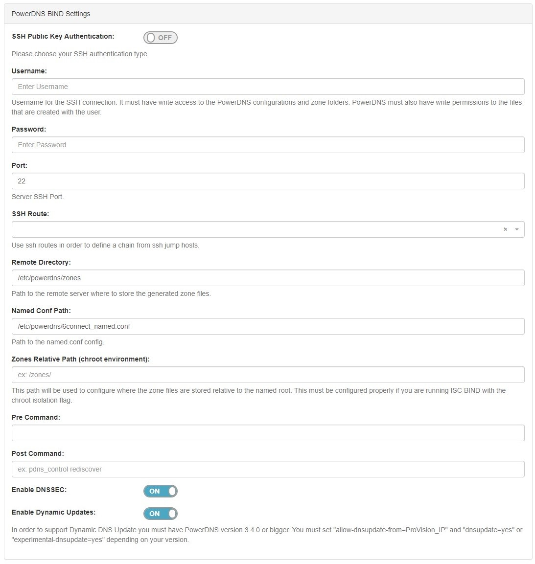 The integration does not require a remote database connection, but it does require an SSH account and a writable directory. The SSH account must have access to the server. This account will also be used for DNSSEC functionality within PowerDNS.
