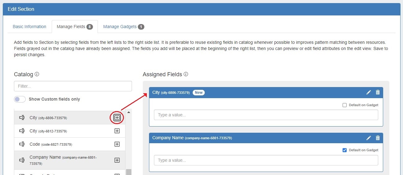 Once the fields are added to the section, they are available in the Fields Gadget and Edit Fields modal.