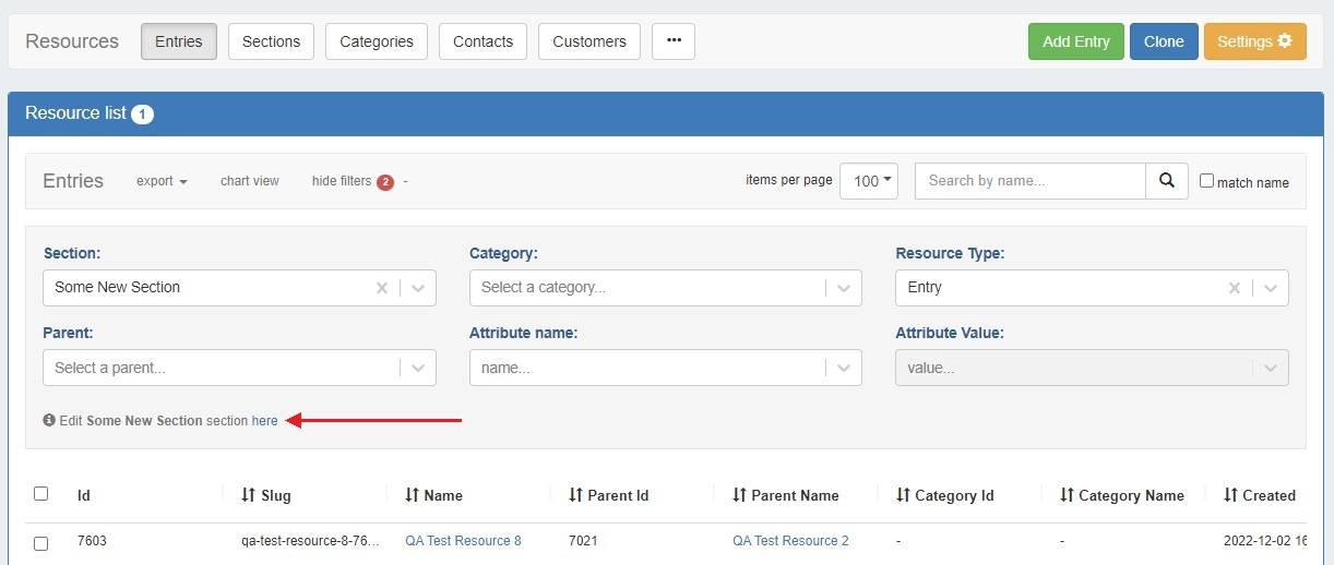 You can also access the edit screen from the section's entry list. Open the filter panel at top and click the link at the bottom.