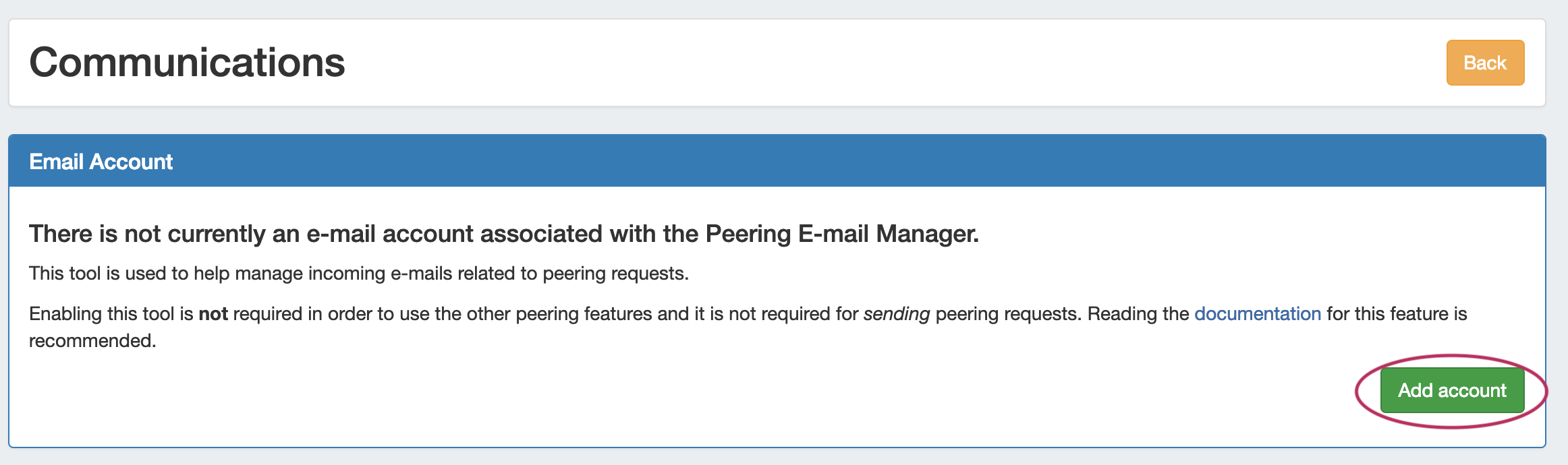 If an account is not currently set, status information and and the option to add a new email account will be available. Click "Add Account".