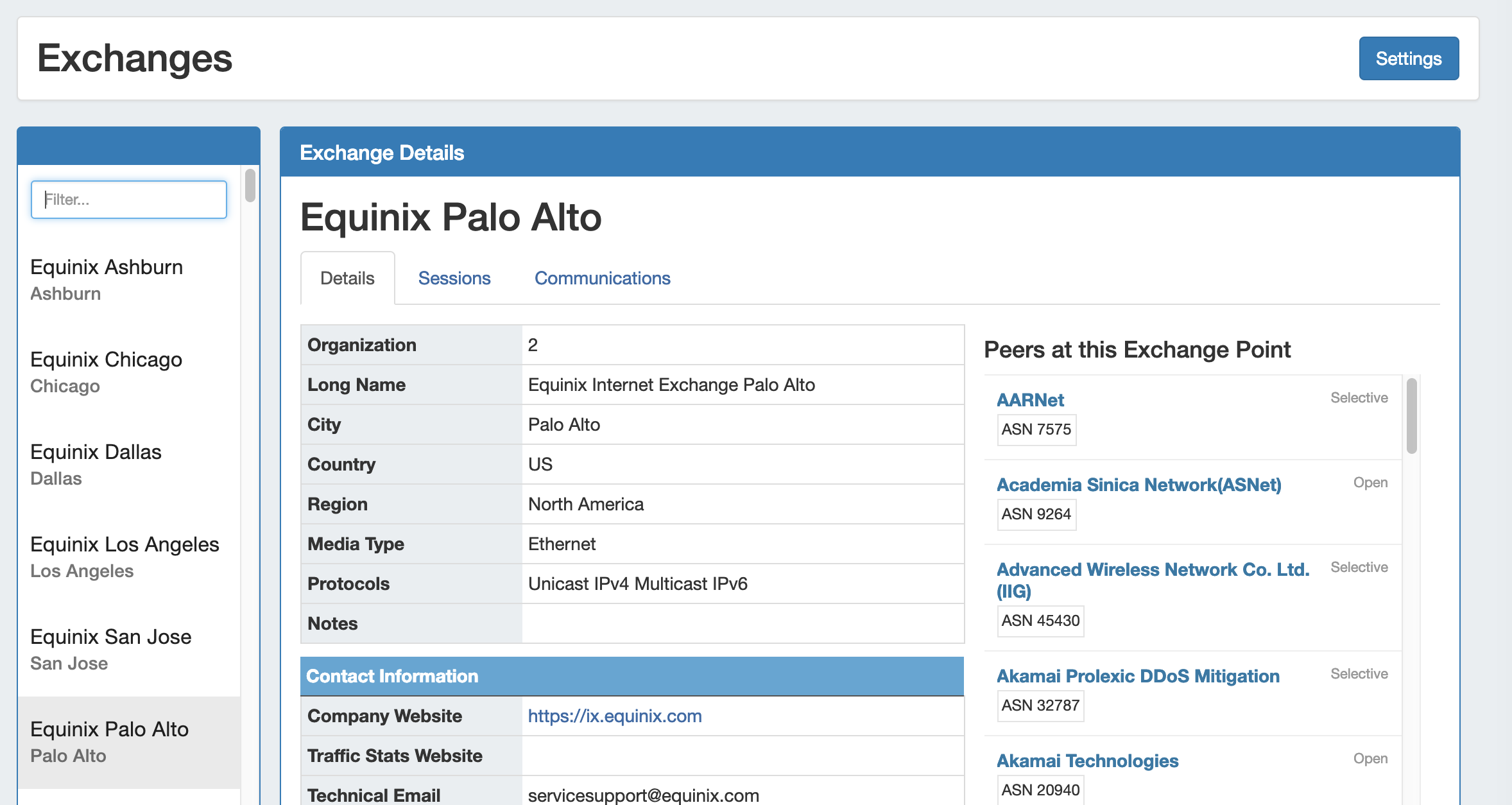 Clicking on the name of any peer in the under the "Peers at this Exchange Point" list will open the Peer Details page.