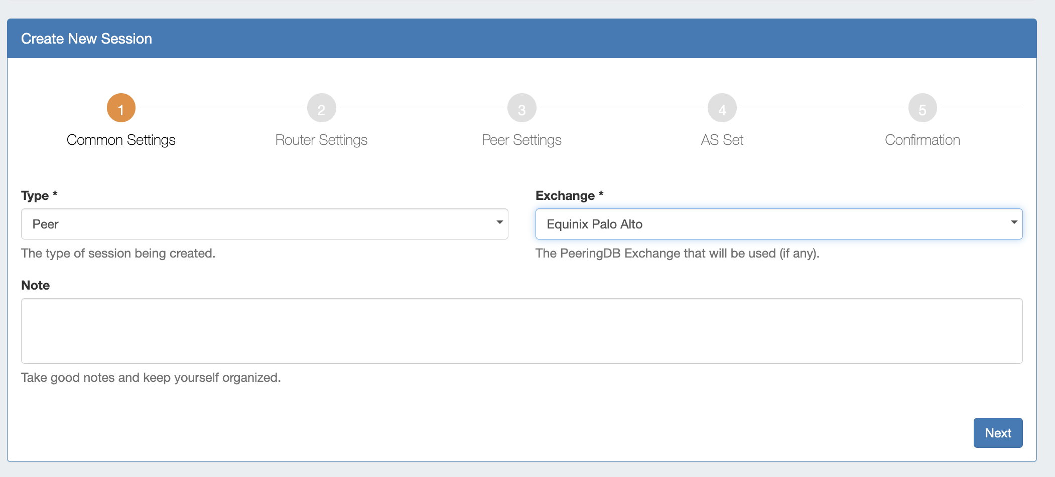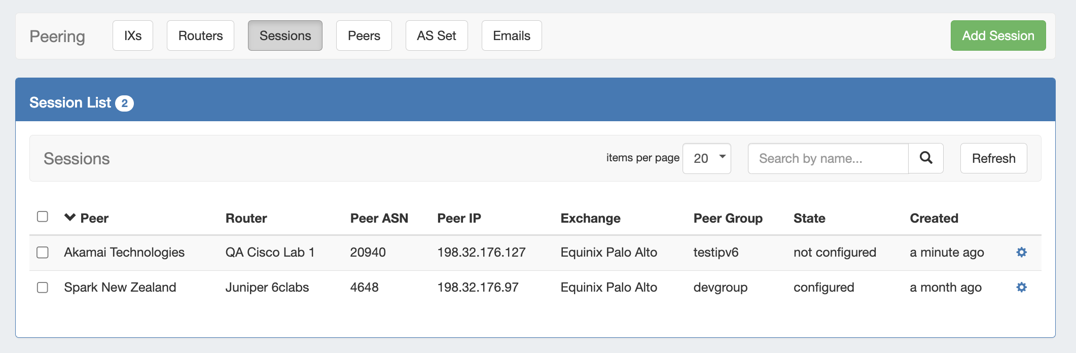 Add a new session by clicking the "Add Session" button from the Peering → Sessions sub-tab.