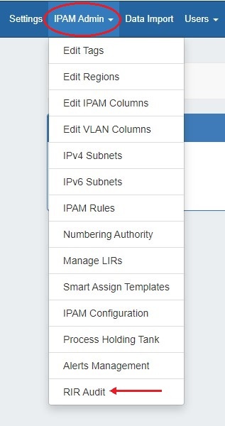 To access, select "RIR Audit" from the Admin → IPAM Admin dropdown menu.