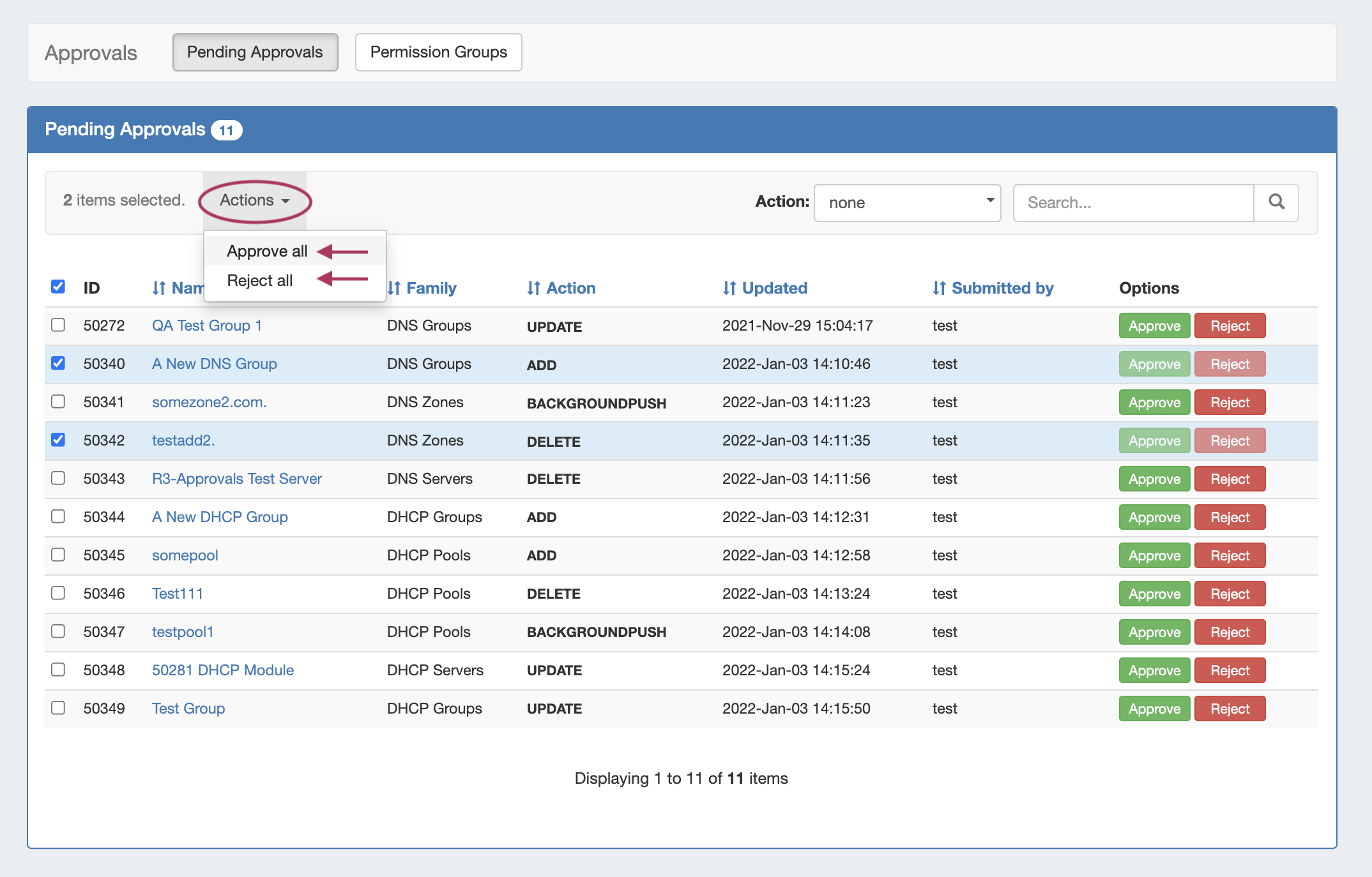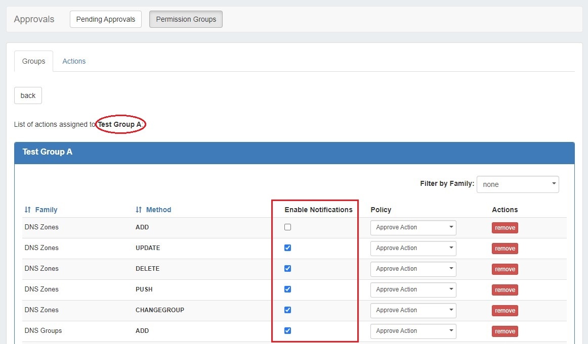 - Submitter makes an action (either by action type or DNS Family) that requires approval