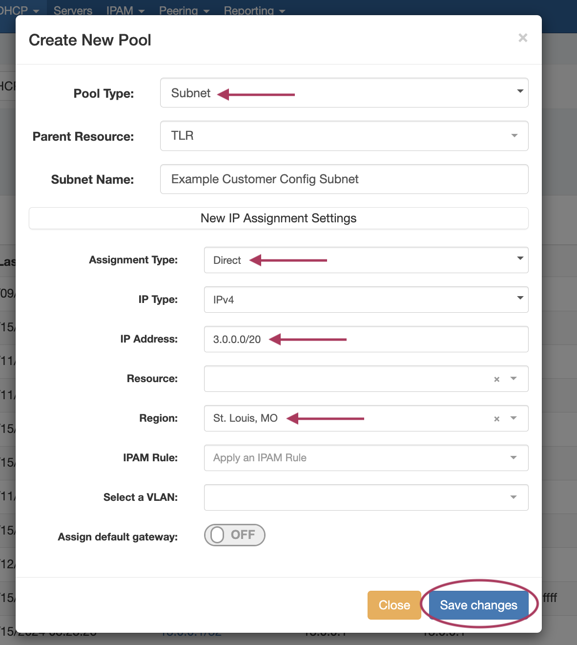 2. Go to DHCP Tab → Add Pool. Direct assign a new subnet pool to that CIDR, selecting the region and other filter criteria associated with the APNIC aggregate. Click "Save Changes" to create the pool.