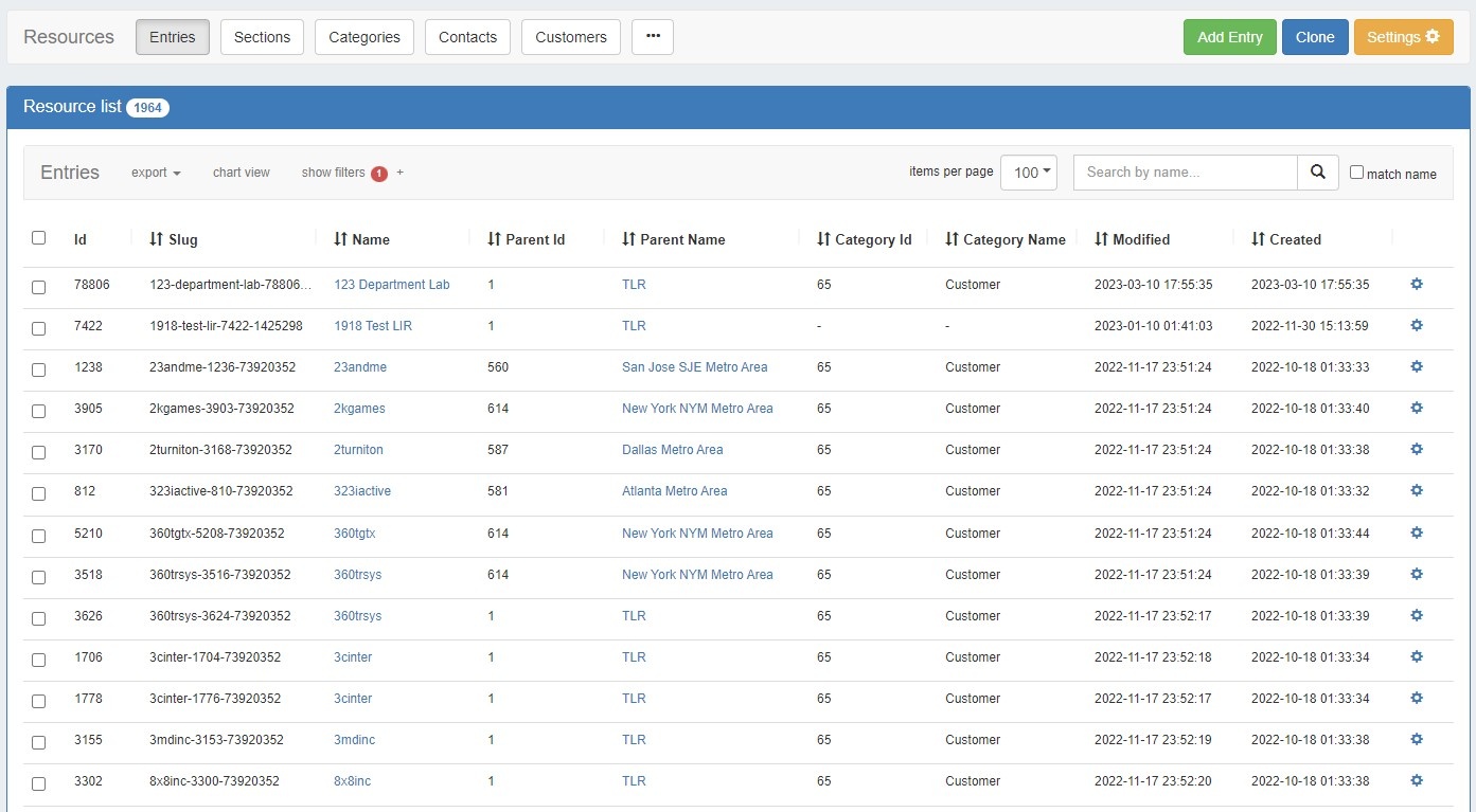 This feature can be used to quickly and efficiently create multiple resources with same format, field information, or similar hierarchy structure. One example may be a datacenter with x number racks with y number of servers on each. One rack, with its servers as child entries could be created, and then cloned until the necessary quantity is reached. As text field information is copied during the clone, changes in individual server information would still need reviewed and updated. Think of cloning as creating a template from an existing resource entry.