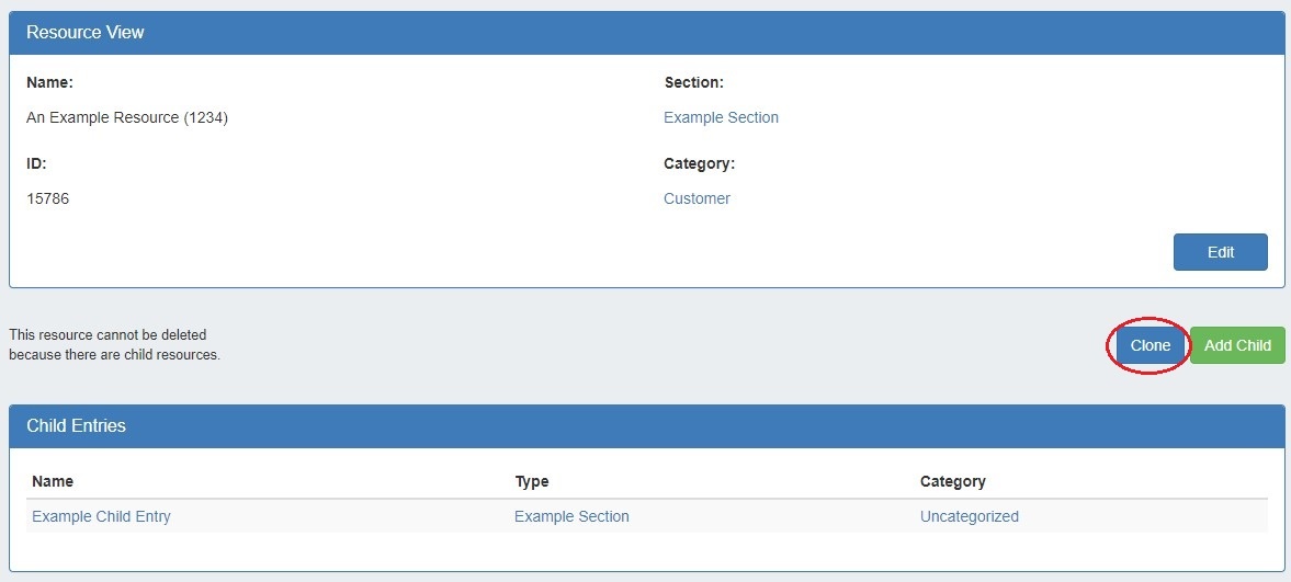 You may also select "Clone" from the bottom of a resource entry page, in which case the entry page you clicked "Clone" from will be automatically selected as the resource to clone.