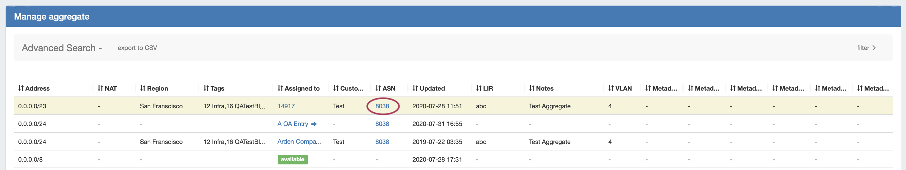 An ASN in IPAM Manage will link to the created resource, which will display all IP Blocks in ProVision with that ASN value. SystemAS resources may not be edited, however they may be deleted by an admin if desired.