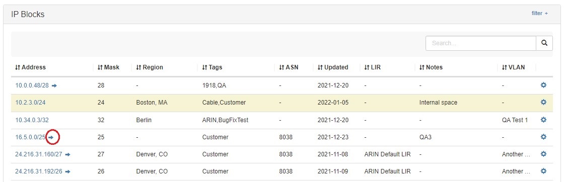 If a block is subassignable, a blue arrow will display in the "Assigned To" field in IPAM Manage.